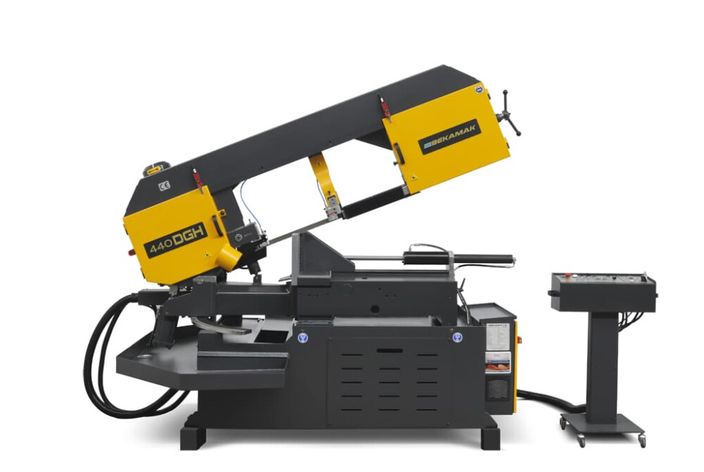 Zware zaagmachine met hydraulische klemming en met verstek. Halfautomaat met hydraulische klemming. Voorzien van hydraulische zaagbladspanning, inverter voor traploos instelbare zaagsnelheid, koelunit, micro-doseersysteem, en een digitaal uitleesbaar verstek.