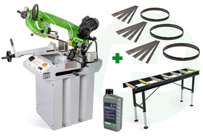 Dit product is een bandzaagmachine combipakket voor metaalbewerking, geschikt voor het nauwkeurig zagen van metalen profielen, buizen en massief materiaal. Het pakket bestaat uit een robuuste bandzaagmachine op onderstel, aangevuld met essentiële accessoires zoals zaaglinten, aandrijfriemen, koel-/smeermiddel en een rollenbaan voor materiaalondersteuning. Ideaal voor werkplaatsen en professionele gebruikers die direct compleet willen starten.
