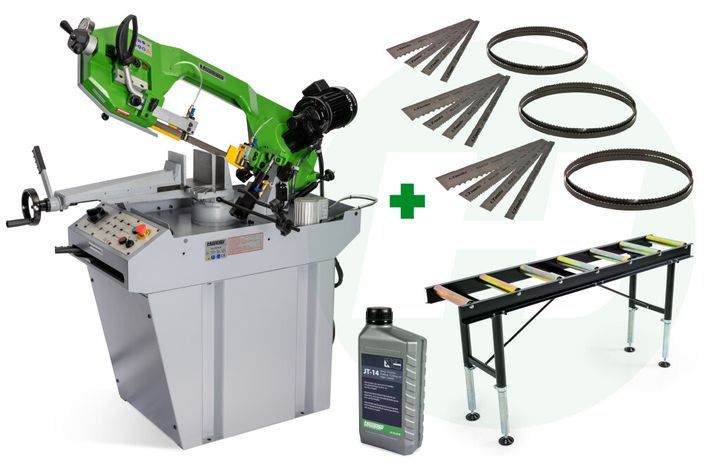 | Inclusief accessoires — geleverd met rollenbaan, meerdere zaagbladen, zaagsmeerolie, enz., afhankelijk van de pakketinhoud. |