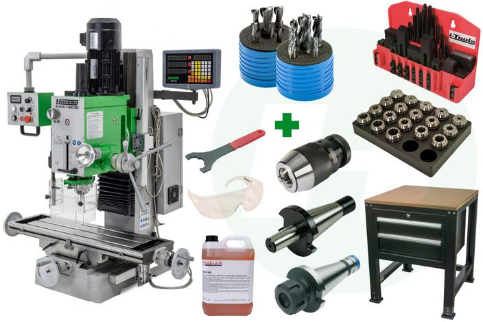| Compleet promo-pakket: Inclusief onderstel met 2 laden voor gereedschap, spantanghouder, 18-delige spantangenset, snelspan-boorkop (1-16 mm), 52-delige opspangereedschap set, freesklem, spiebaan- en vingerfrezen, 5 L bio-snijolie en veiligheidsbril. |