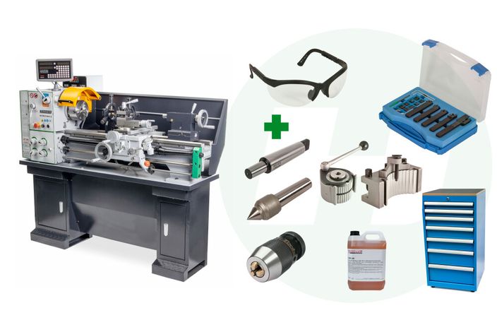 | Complete set standaardaccessoires: Inclusief 160 mm 3-klauwplaat, 160 mm 4-klauwplaat, vaste en meelopende bril (steady), 2 centers, set wisselwielen en stelplaat — alles voor een brede set draaibewerkingen. |