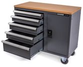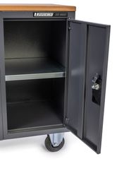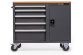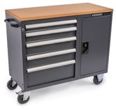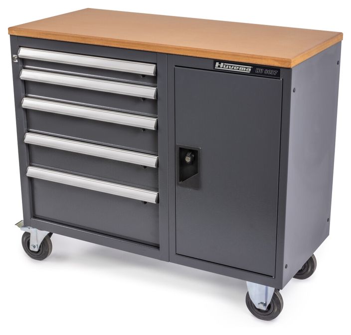 Huvema gereedschapswagen. Deze gereedschapskar van Europees fabrikaat wordt veel gebruikt in garages en werkplaatsen, voor het opslaan en wegleggen van gereedschap en machines. De wagen heeft een gelaste stalen constructie en een centraal vergrendelingssysteem met 2 sleutels. De werkplaatswagen is gepoedercoat. Deze gereedschapswagen is gemaakt in Europa, met een degelijke kwaliteit van het plaatwerk en een hoge kwaliteit van de gereedschapskar in zijn totaliteit. Dankzij het MDF werkblad, kan de verrijdbare gereedschapswagen ook als mobiele werkbank worden gebruikt.