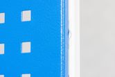 Deze geperforeerde metalen gereedschapswand is voorzien van gaten voor de bevestiging van gereedschapshaken en bakken.