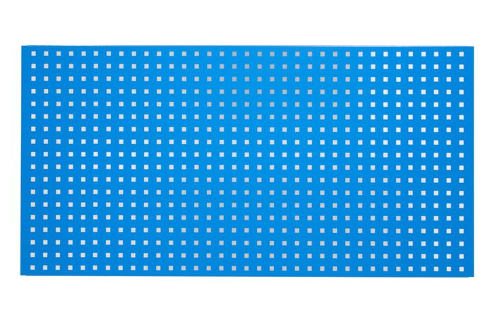 Deze geperforeerde metalen gereedschapswand is voorzien van gaten voor de bevestiging van gereedschapshaken en bakken.