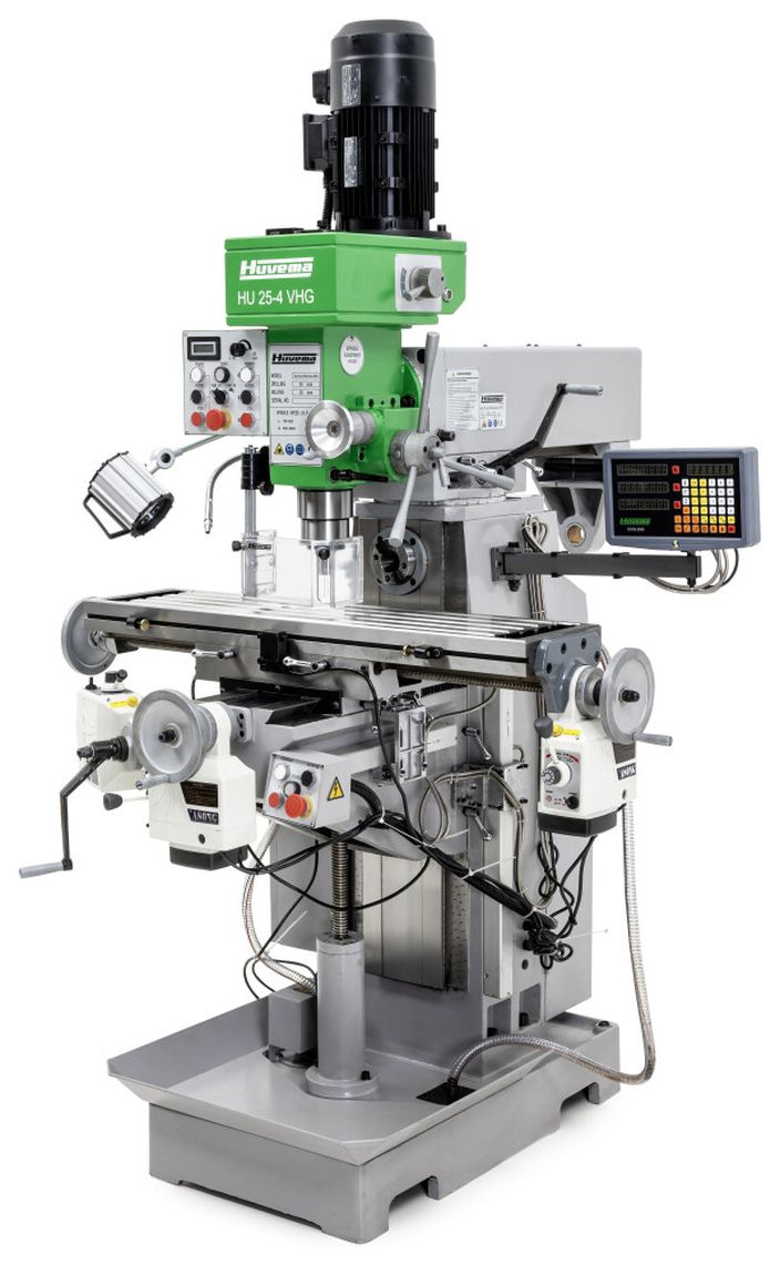 De Huvema HU 25-4 VHG Vario DRO is een universele freesmachine met zowel verticale als horizontale spindel, voorzien van variabel toerental, digitale uitlezing (DRO/Sino) en een koelinstallatie. Hij is ontworpen voor werkplaatswerk en veelzijdige freesbewerkingen, met zowel tandwiel- als riemaandrijving afhankelijk van de richting van de spindel. De machine combineert precisie en flexibiliteit met goede vermogens- en bewegingsmogelijkheden.