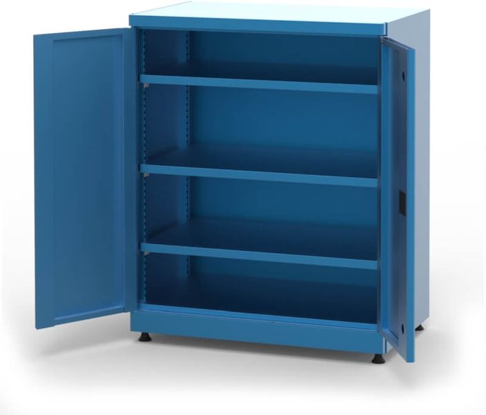 Kast voor bescherming en opslag van materialen en onderdelen in werkplaatsen en fabrieken. Met deuren die volledig geopend kunnen worden voor een goede toegang. Gelaste, sterke stalen constructie. Met ingebouwde grip en cilindrische veiligheidsslot.