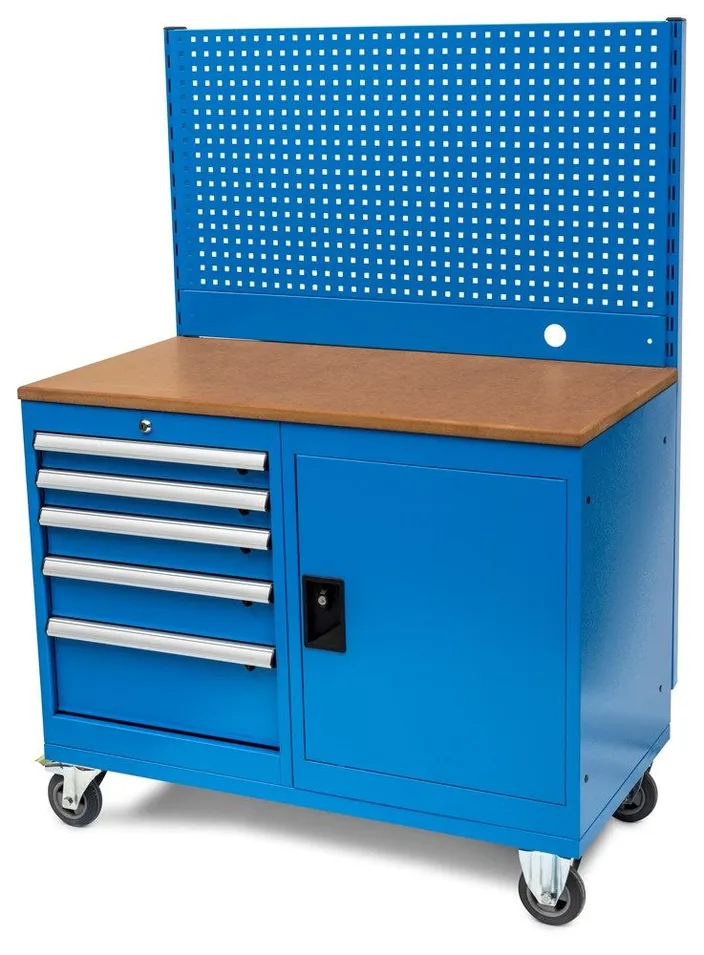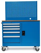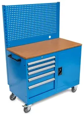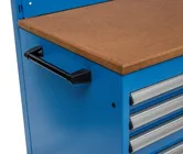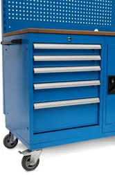 Deze mobiele werkbank van Huvema is ideaal voor het verrichten van werkzaamheden, zowel op een vaste plek als mobiel. Veel gebruikt in de industrie, werkplaatsen etc. De laden openen geruisloos en gemakkelijk dankzij kogellagers. De laden kunnen tot 98% worden uitgetrokken, zodat diverse producten achterin de kast gemakkelijk kunnen worden gepakt en opgeslagen. Elke lade heeft een draagvermogen van maximaal 80 kg, met centrale vergrendeling. Deze werkbank van Europese fabrikaat is zeer robuust door zijn 1.2 mm gelaste staalwerk met versterkingspunten op alle 4 de hoeken, hierbij komt ook de poedercoat finish kijken voor een optimale sterkte.