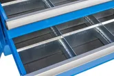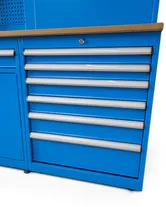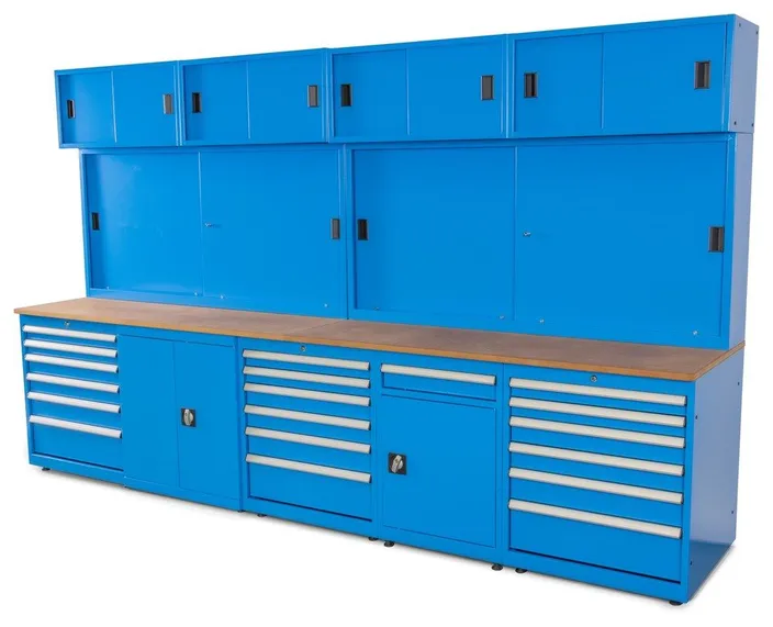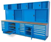 Deze complete werkbank is voorzien van 19 lades, 1 onderkast met uittrekbare legborden, 1 onderkast met vast legbord, een brede gereedschapswand met schuifdeuren én 4 overige kastjes boven de gereedschapswand. De verschillende lades in de onderkasten hebben diverse hoogtes, om de opslagmogelijkheden divers te houden,. Deze lades hebben een draagcapaciteit van 80 kg. De lades worden geleverd inclusief anti-slip mat én ladeverdeling. Elk ladeblok kan centraal worden vergrendeld met sleutel. De onderkasten met legborden hebben een ruime capaciteit van 50 én 80 kg. en zijn te vergrendelen met sleutel.