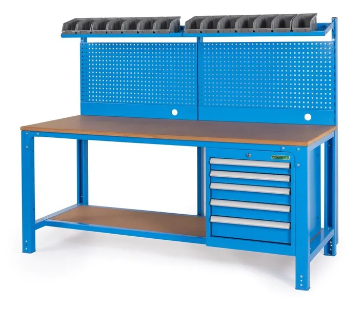 De K3260 is een robuuste werktafel van 2000 mm lengte. De werkbank wordt compleet geleverd inclusief gereedschapswand, bakjes én ladekast. Deze werkbank heeft een draagvermogen van 400 kg en is dus zeer goed inzetbaar voor diverse zware werkzaamheden.