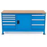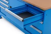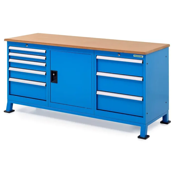 Complete werkbank met 3 afsluitbare compartimenten, waarvan 2 met in totaal 8 lades. Optimale indeling.
